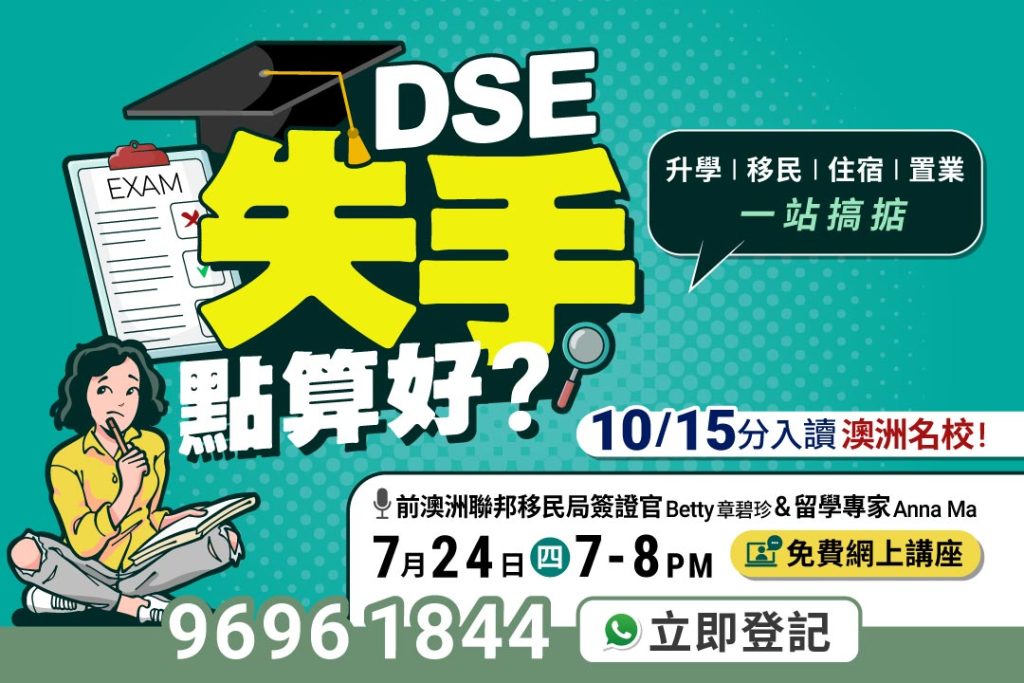 免費講座:DSE失手點算好? 10/15分 入讀澳洲名校 ?! 升學 | 移民 | 住宿 | 置業 一站搞掂(7月24日)