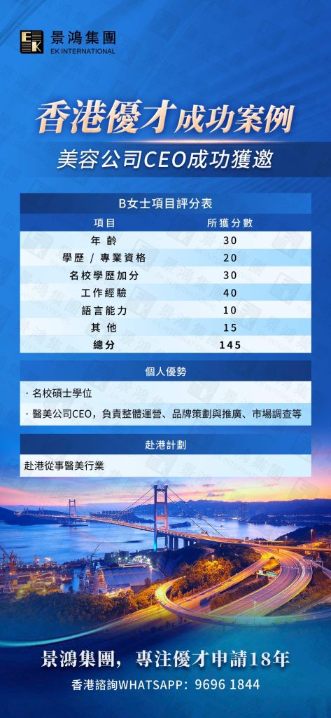成功案例: B女士(美容公司CEO)以 145分 高分成功獲邀赴港。