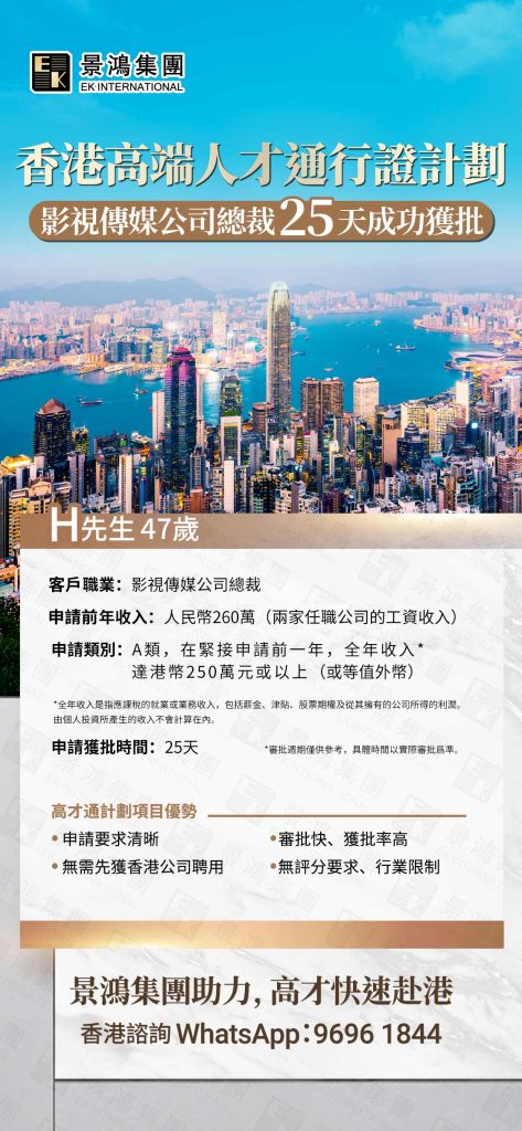 成功案例: H先生(影視傳媒公司總裁),僅用 25天獲批 香港高才通A類簽證!